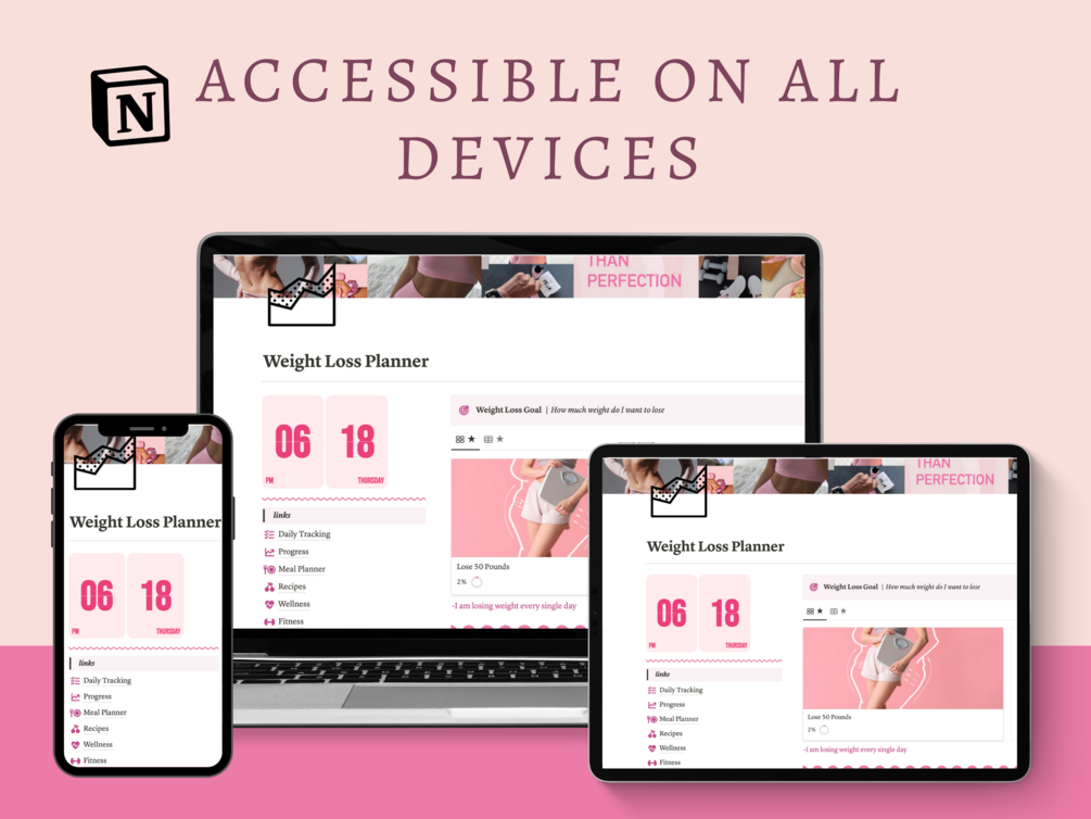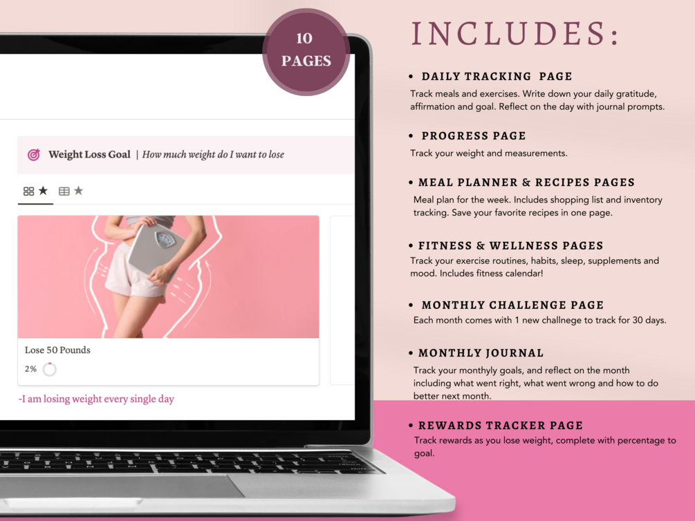 Are you ready to lose weight? This Notion Weight Loss Planner makes it easy to achieve your weight loss goals, feel empowered and motivated to stick to those goals. It's time to become a healthier & happier version of yourself!